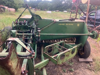 John Deere Model 10 High Density baler. Running, complete. Has the central lubrication option-all the plastic lines for this option need replaced, or fittings removed and replaced with grease zerks.